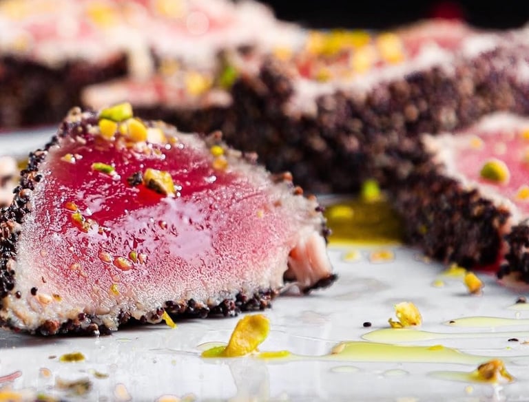 Il nostro tataki di tonno. Appena scottato all'esterno, scioglievole all'interno. È qui che la freschezza assoluta della nostra materia prima sposa la creatività in cucina, per un morso che sorprende a ogni assaggio.